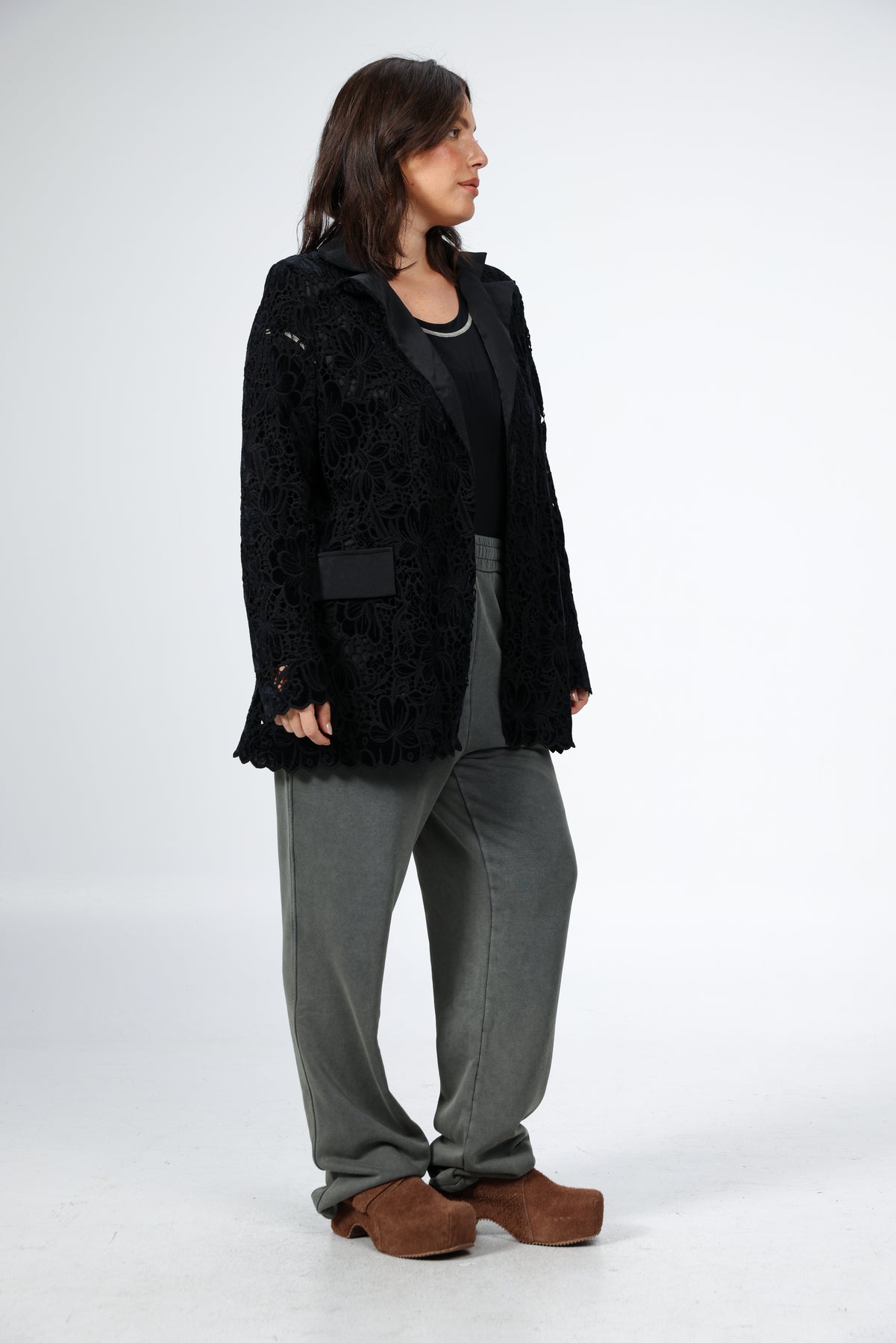 בלייזר שחור לנשים מידה גדולה Black Floral Lace & Velvet Blazer