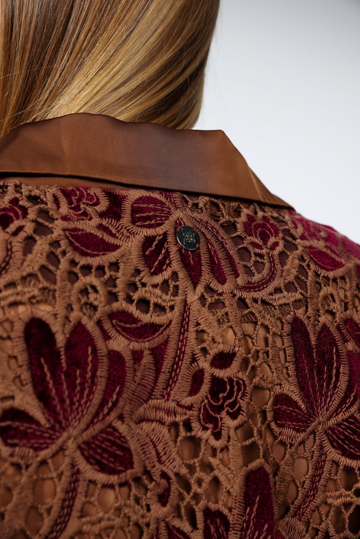 בלייזר תחרה פרחוני בצבעים חום ויין Brown Floral Lace & Velvet Blazer