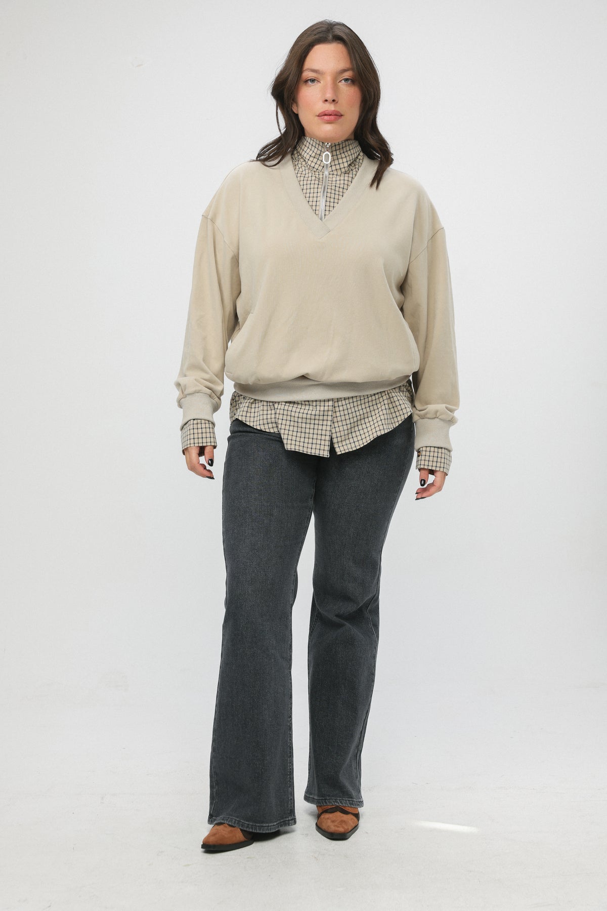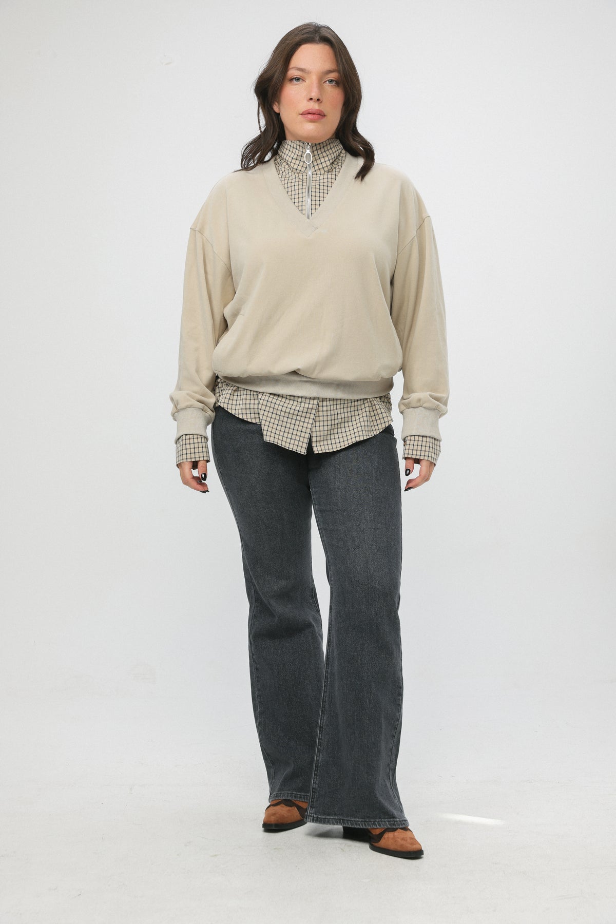 - Plaid shirt hem, cuffs and neck