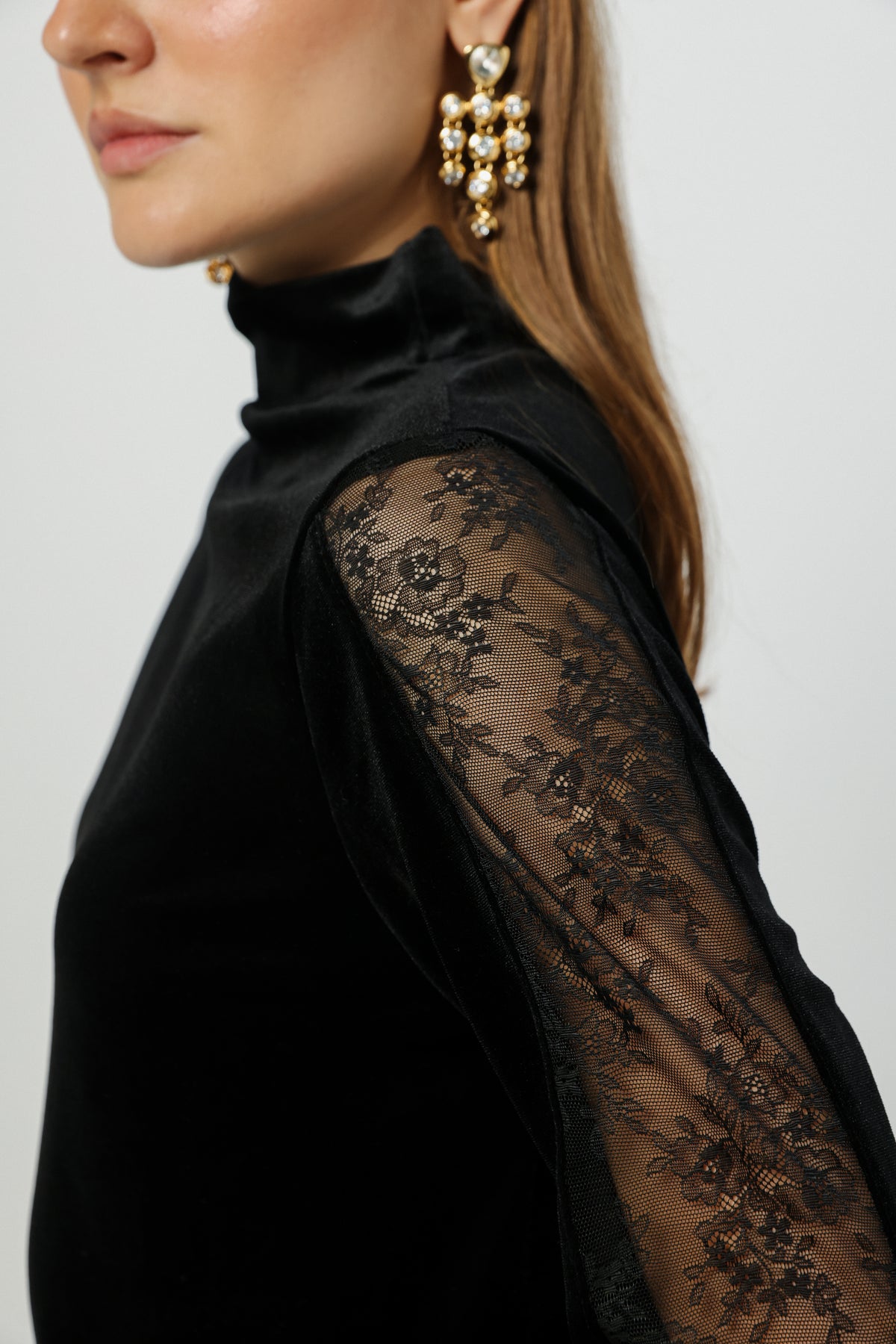 - Sheer lace sleeves