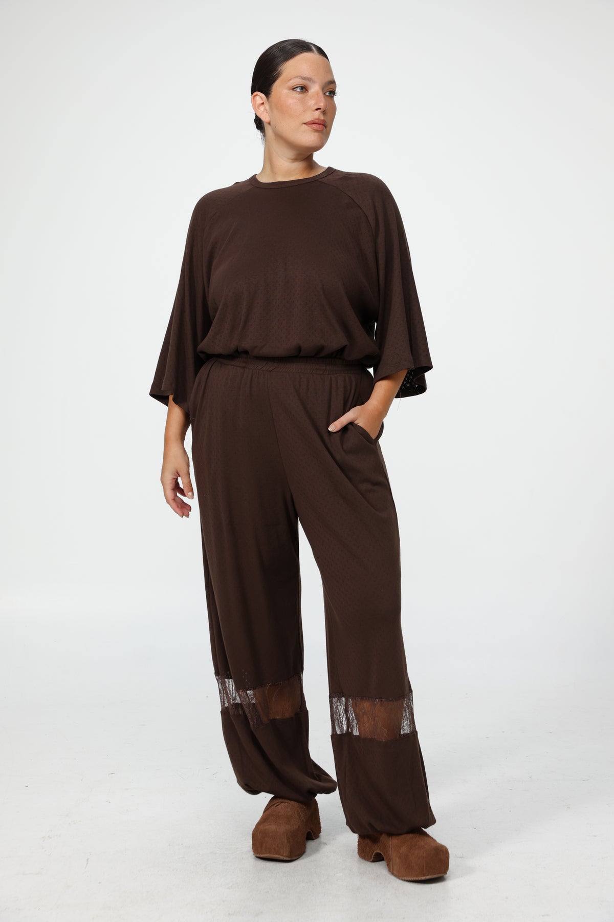 - Relaxed pants with elasticated waistband and lace detail