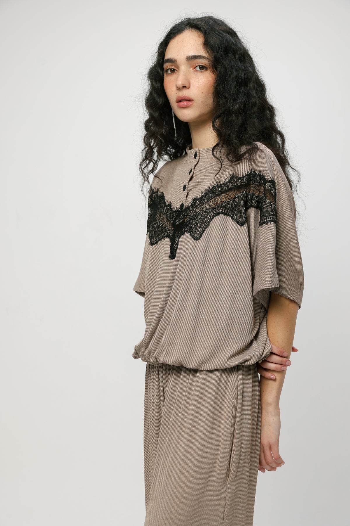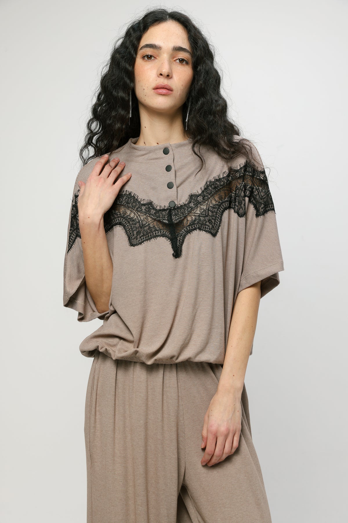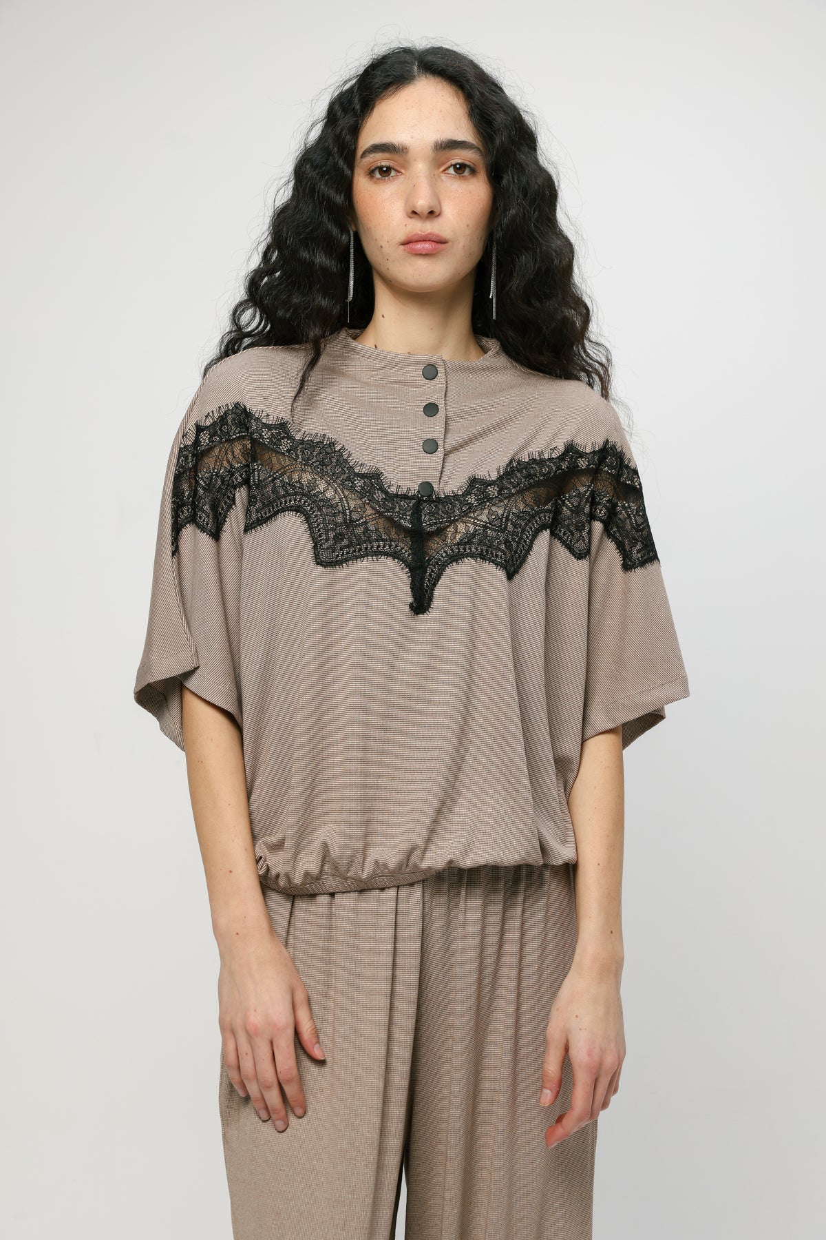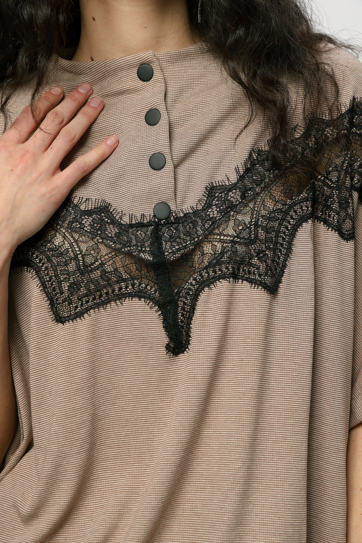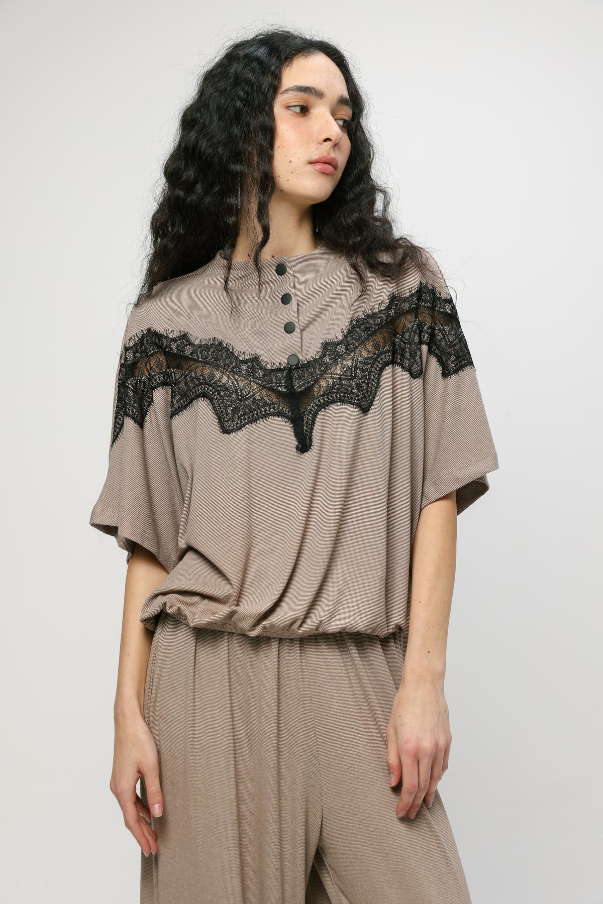 - High neckline with snap button placket
