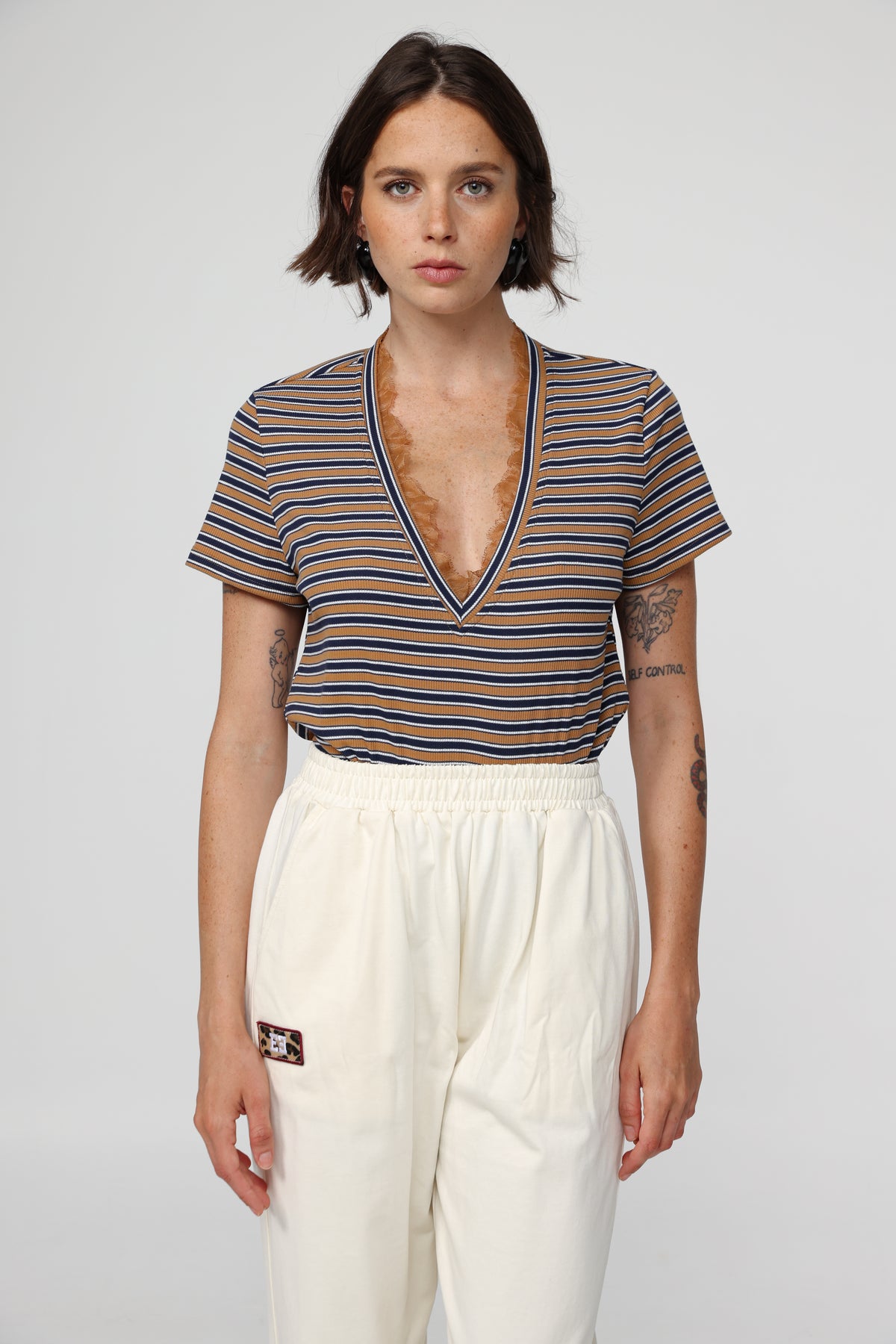 - Deep V neck