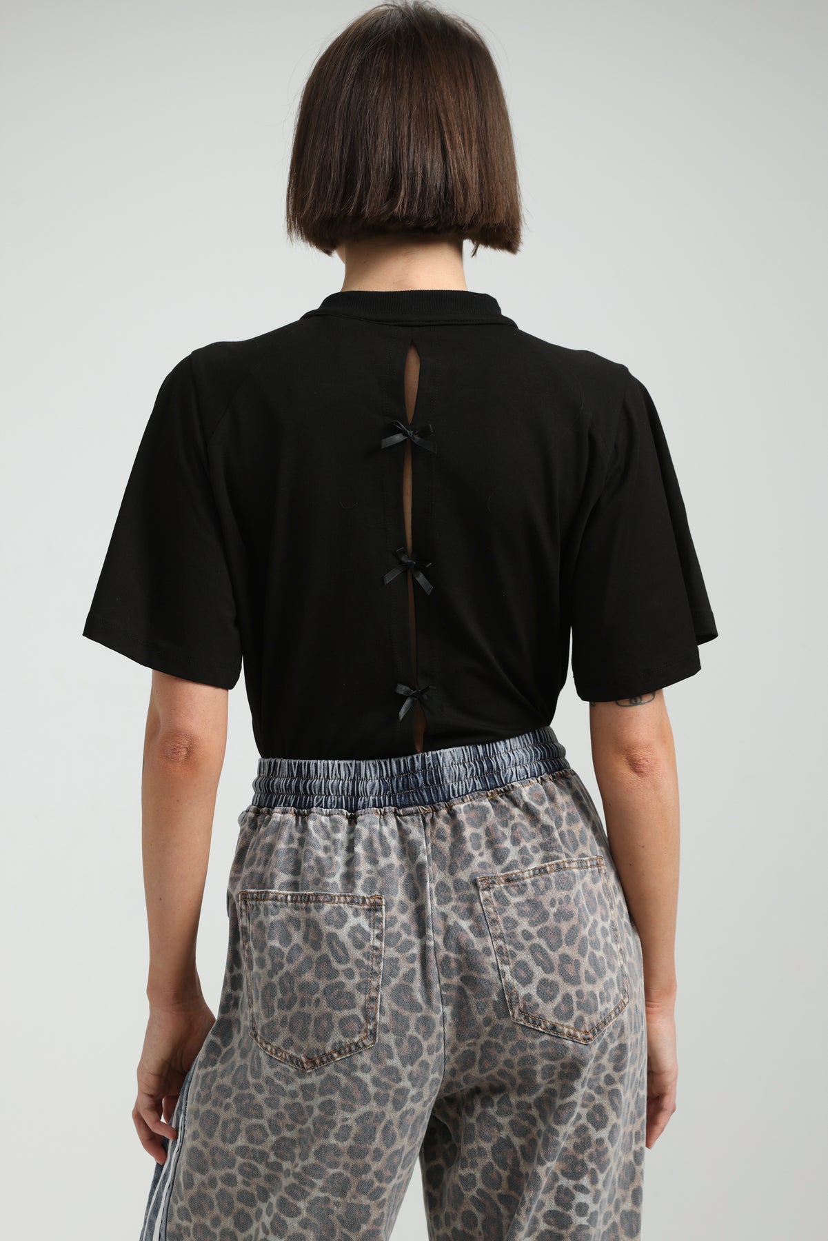 - Back slit detail with bow tie accents