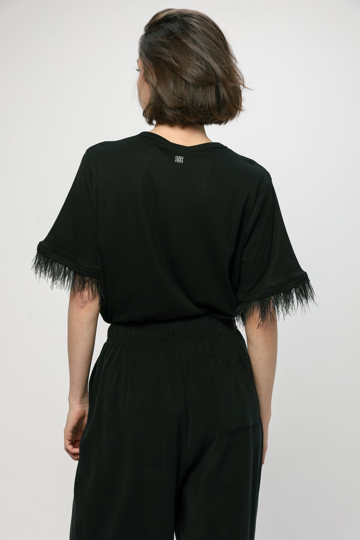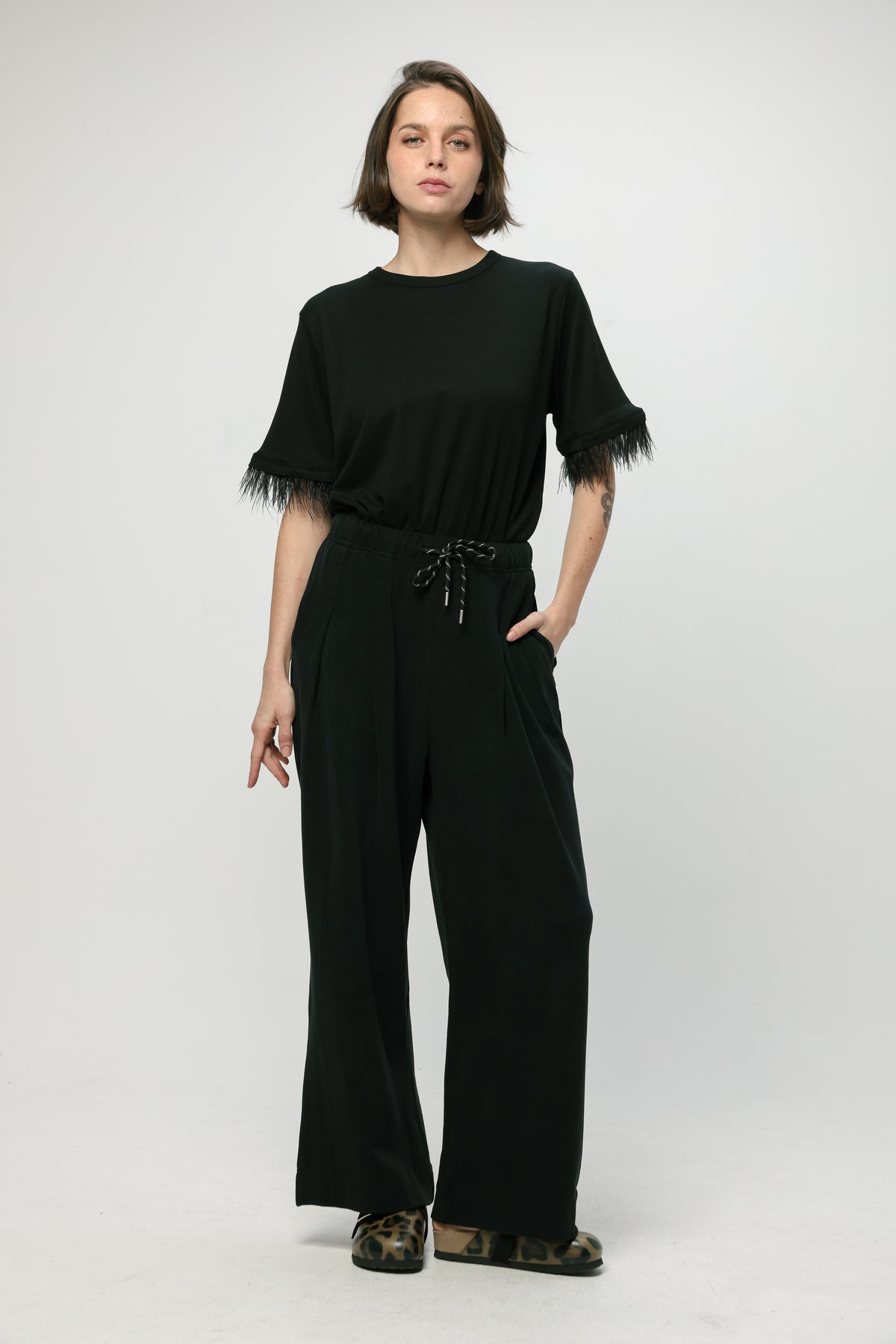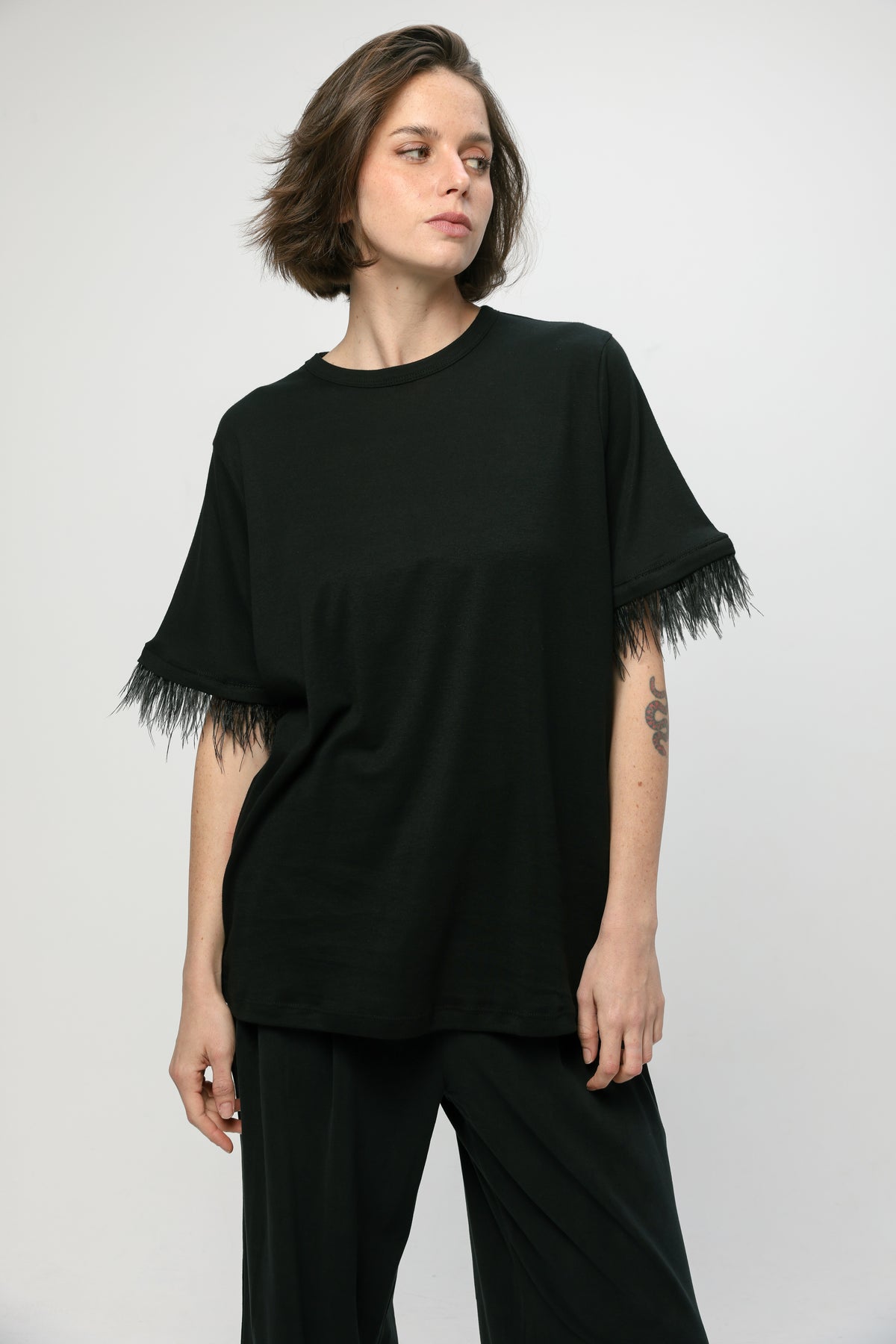 - Feather trim at sleeve