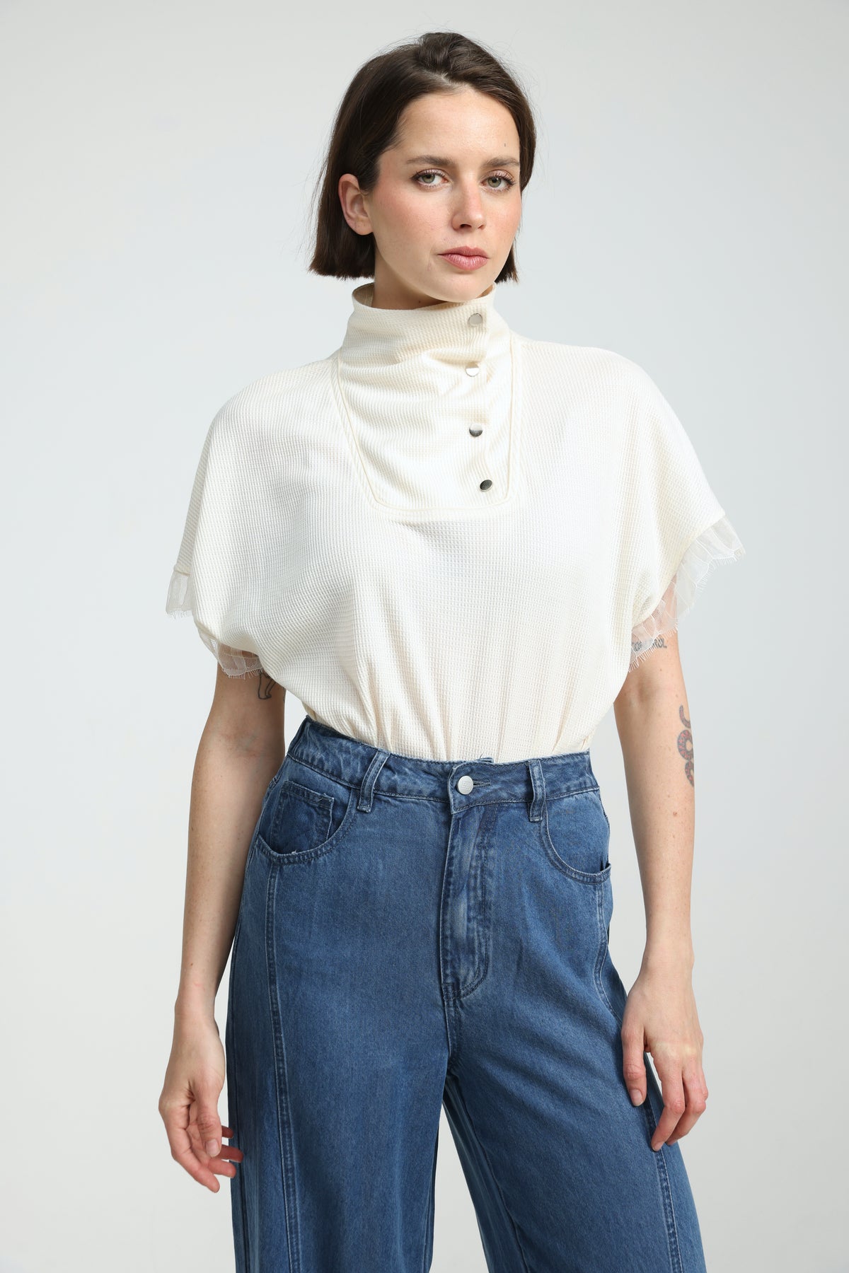 - Wide short sleeves with lace trim